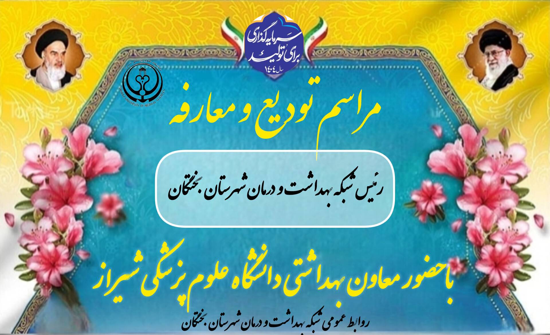 اطلاعیه مراسم تودیع و معارفه رئیس شبکه بهداشت و درمان شهرستان بختگان با حضور معاون بهداشتی دانشگاه علوم پزشکی شیراز